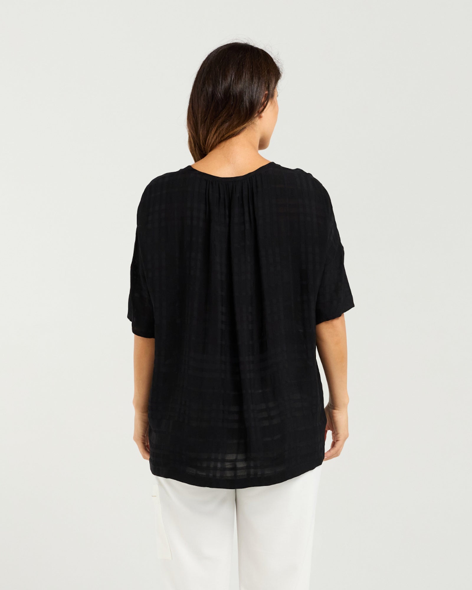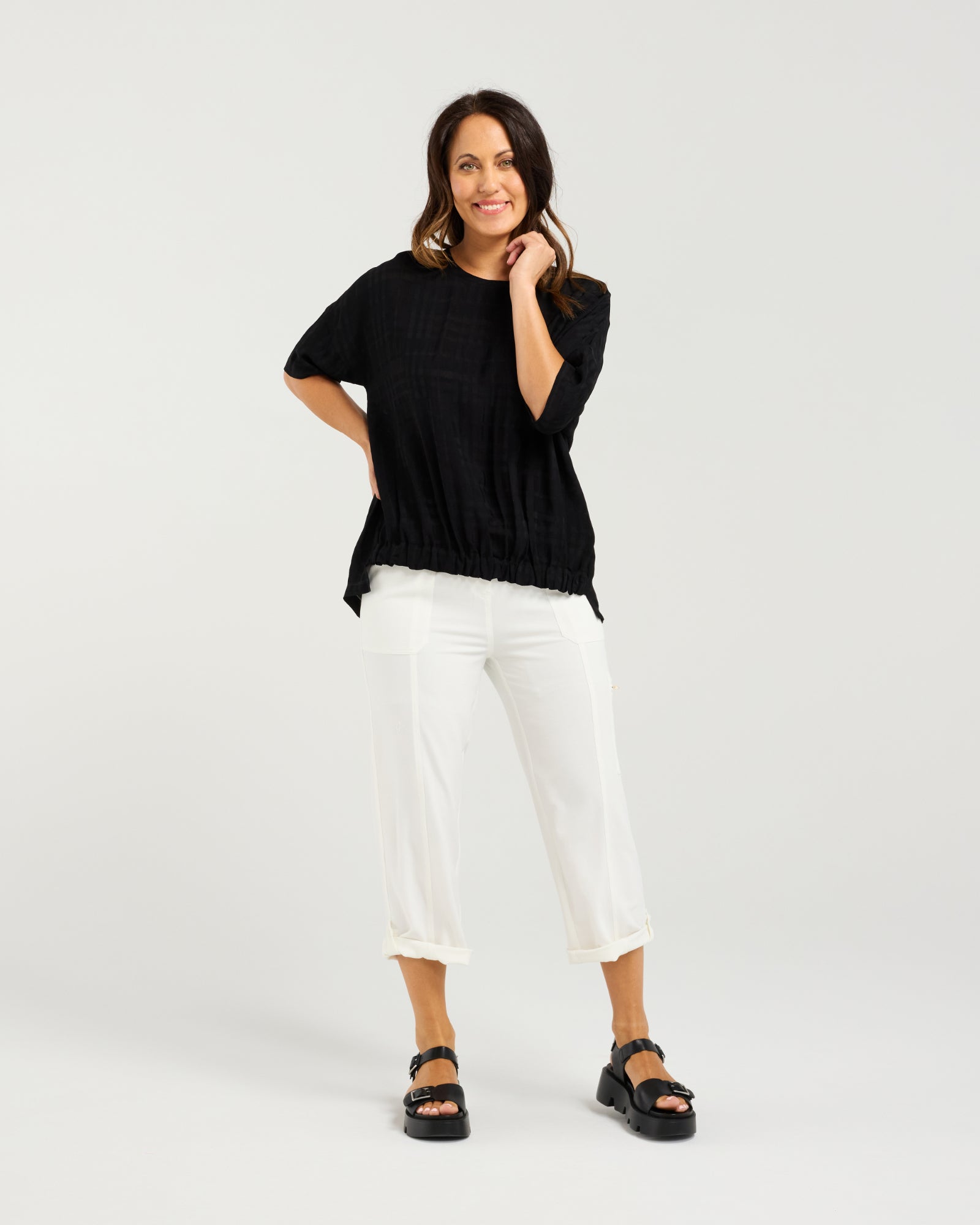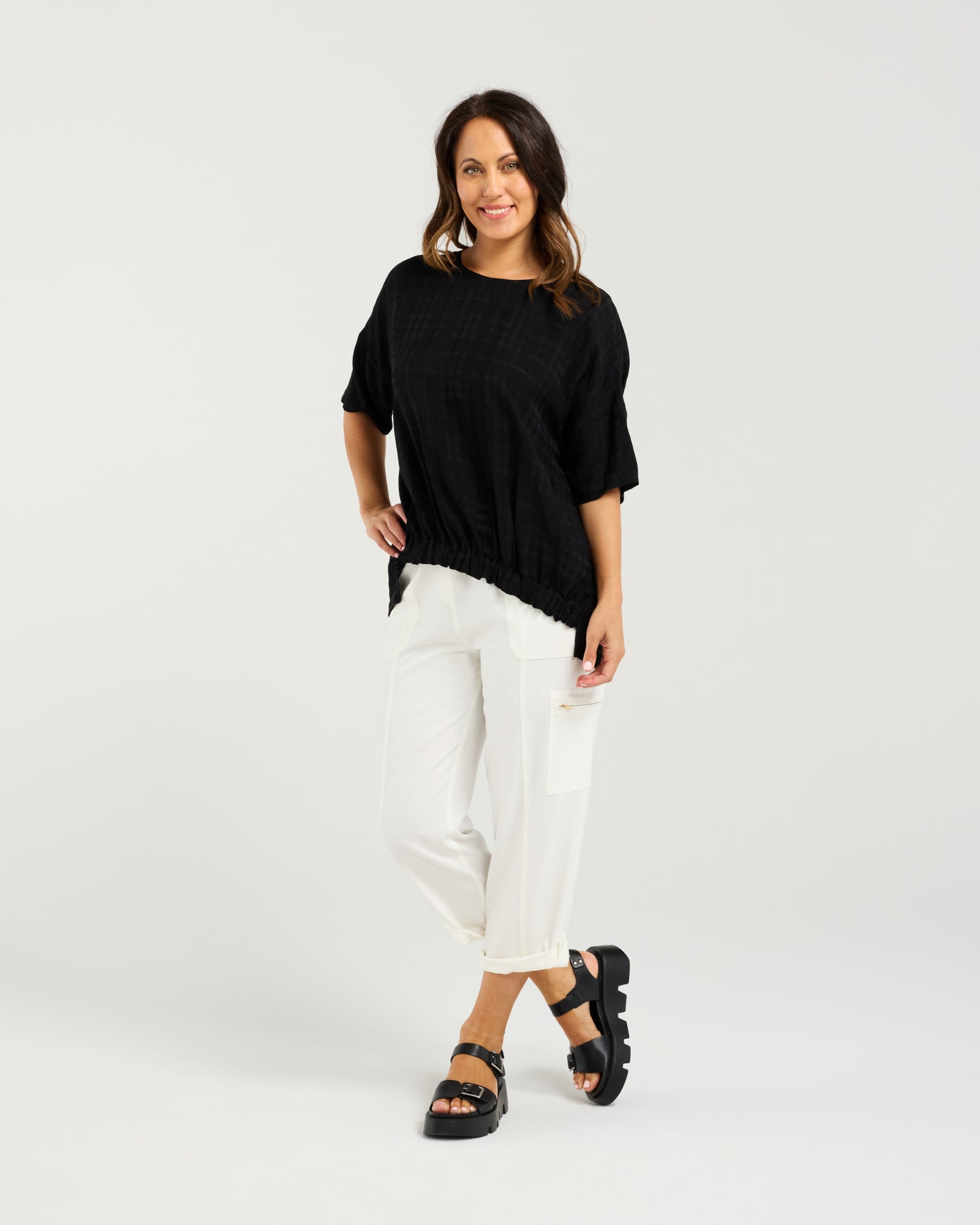 Our timeless top with a gathered front waistband and slightly longer finish in the back with a subtle plaid as an added detail.